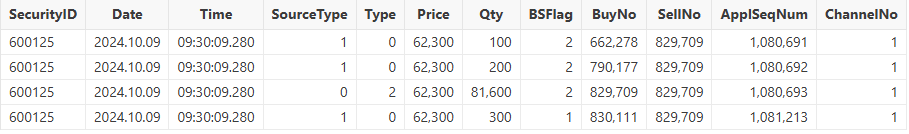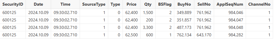 colNames = `SecurityID`Date`Time`SourceType`Type`Price`Qty`BSFlag`BuyNo`SellNo`ApplSeqNum`ChannelNo