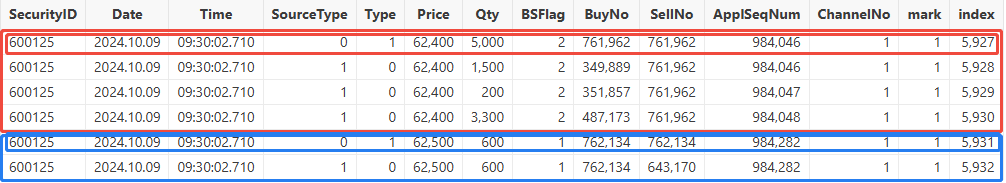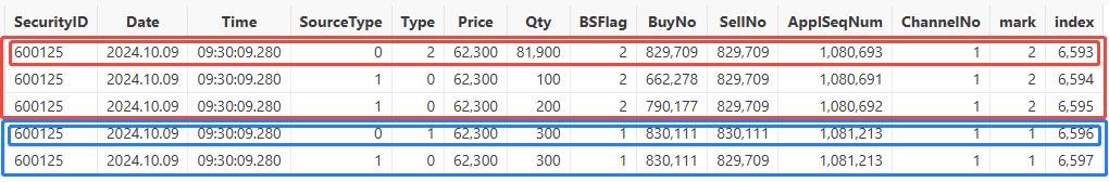 经过引擎还原后,可以看到 outTable 中,index 为 6593 的记录为原始委托,原始委托量为 81900,等于 tmp 中的委托量 81600 与立即成交量