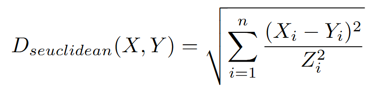 计算两个数值向量(X 和 Y)之间的标准化欧式距离,先将 X 和 Y 分别标准化处理后,再调用 euclidean。公式定义如下: