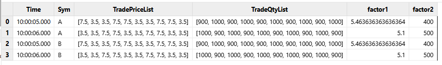 colNames = [`Time, `Sym, `TradePriceList, `TradeQtyList, `factor1, `factor2]