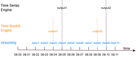 timeBucket2 = createTimeBucketEngine(name="timeBucket2", timeCutPoints=timeCutPoints, metrics=<[first(firstPrice), max(maxPrice), min(minPrice), last(lastPrice), sum(sumVolume)]>, dummyTable=output1, outputTable=output3, timeColumn=`time, keyColumn=`sym, closed='right')