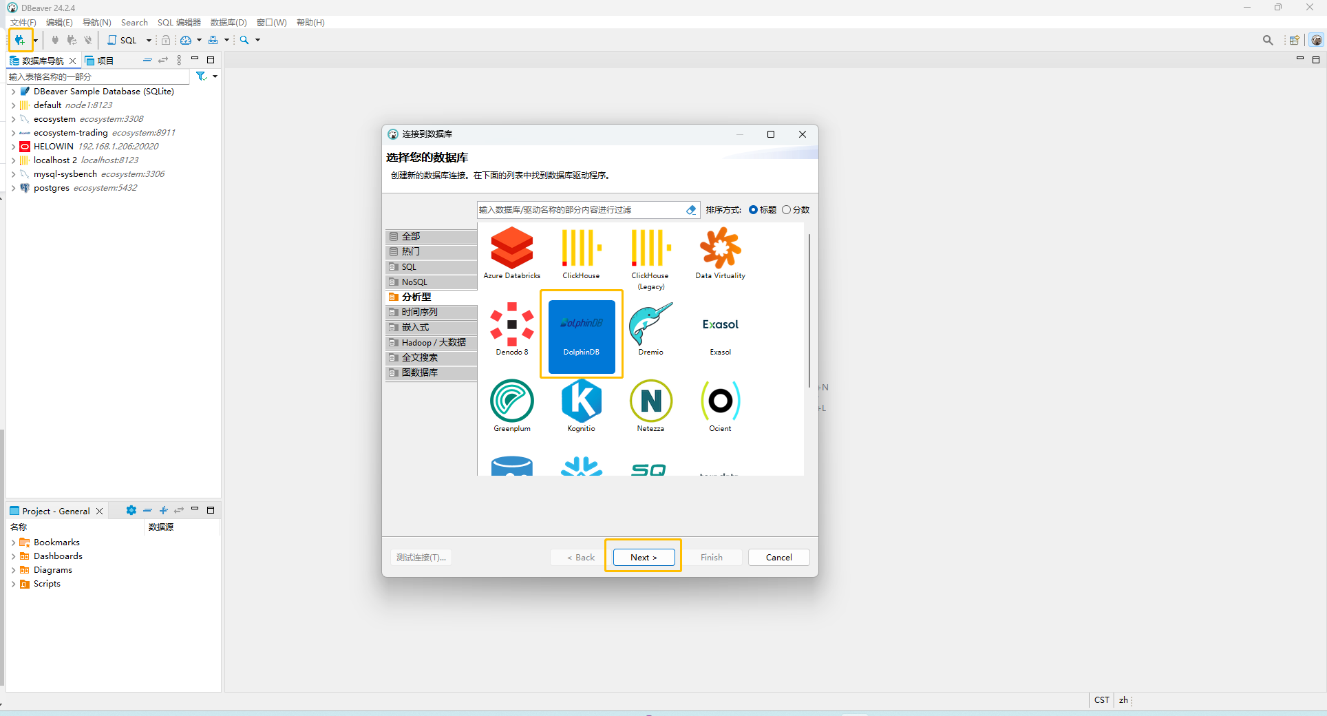 安装完成后, 按图示创建 DolphinDB 数据库连接。