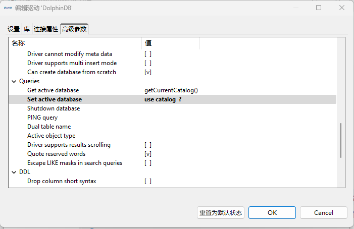 在上述界面中选择 高级参数 → Queries → Set active database,填入属性值