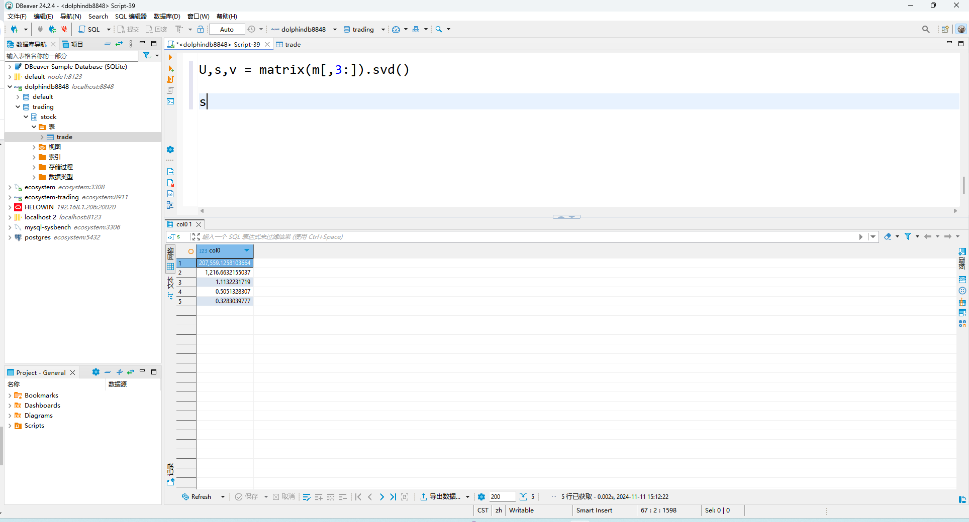 matrix(m[,3:]).svd() 没有返回结果,意味着 DBeaver 不会展示 U, s, v 的值。而运行变量 s