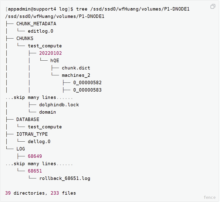 # 查看存储卷 select * from pnodeRun(getConfig{`volumes}) P1-DNODE1 /ssd/ssd0/wfHuang/volumes/P1-DNODE1 P2-DNODE1 /ssd/ssd0/wfHuang/volumes/P2-DNODE1 P3-DNODE1 /ssd/ssd0/wfHuang/volumes/P3-DNODE1到操作系统去查看数据节点 P1-DNODE1 的 volume 目录: