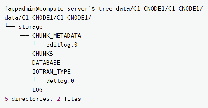 图 2. 图1-2 可看到 P1-DNODE1 作为数据节点,管理着事务 undo/redo 日志文件,和大量的数据块 CHUNKS 文件。但计算节点不需要配置 volume, 查看 C1-CNODE1 的默认 data 目录: