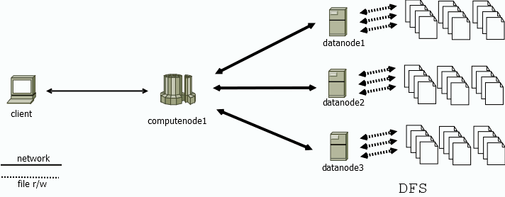 图 4. 图1-4 如上图所示,计算节点 computenode1 负责解析 client 的请求,并协调数据节点 datanode[1-3] 读/写数据(即 map,分布式执行过程)。接收到 datanode[1-3] 的数据后,经过 reduce-merge 过程,将最终结果返回给客户端。存算分离的架构,使得数据节点的物理资源得到隔离,写入和读取数据更为稳定、高效。