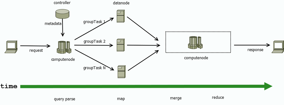 }其中,query parse、merge、reduce 过程发生在计算节点,map 阶段则并行发生于各数据节点。