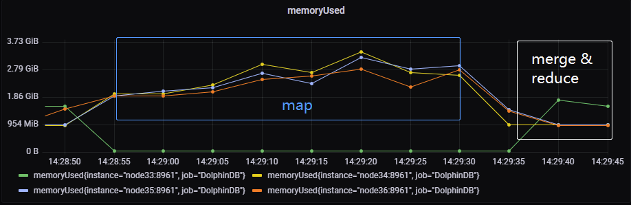可以看出在 map 阶段在数据节点,是分布式、并行执行的。在 merge-reduce 过程中计算节点的内存消耗逐渐增加。