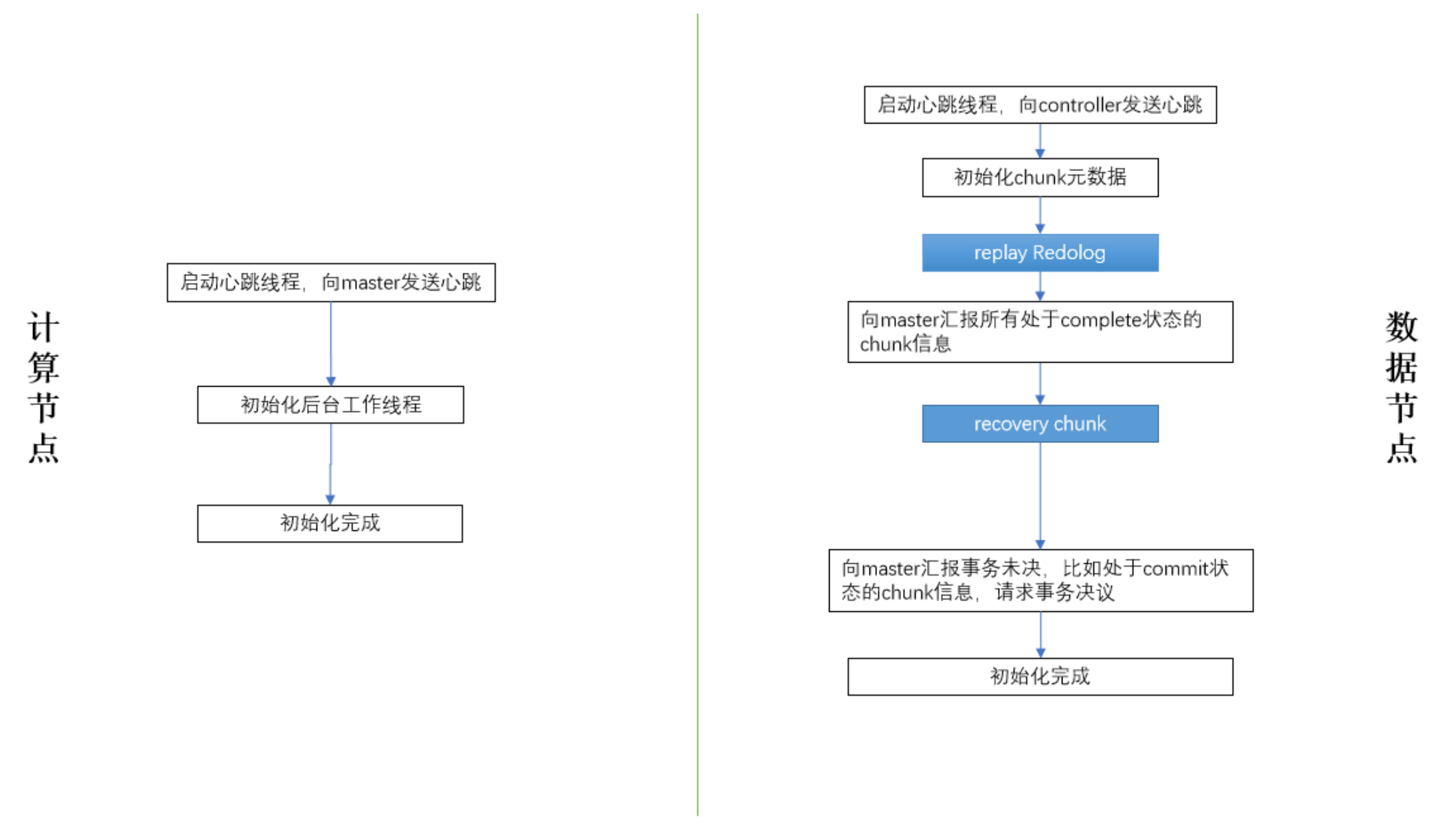 如图,当数据节点启动时,流程中的蓝色标记部分:“回放 redo 日志”,“恢复损坏的 chunk” 等包含了大量的 IO 操作,实际生产环境中耗时为分钟级(具体视数据量大小而定)。而计算节点流程十分精简,可以在秒级完成启动。