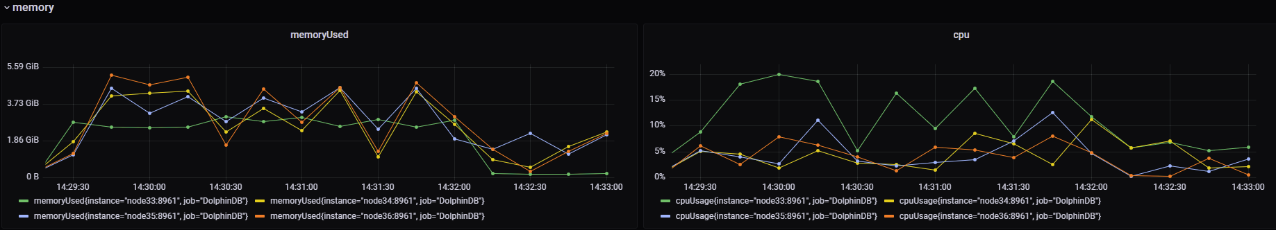 执行过程中,计算节点与数据节点的内存消耗情况如下图所示(node33:计算节点,node34-36:数据节点,下同)。