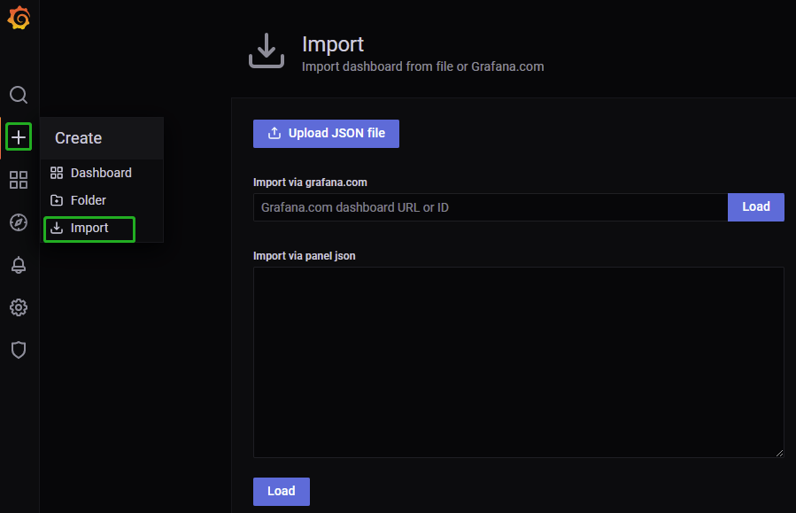 点击 Import -> 输入对应 dashboardID,点击 Load 即可完成导入。