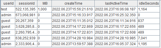 select userId ,sessionId ,memSize/1024/1024 as MB ,localtime(createTime) as createTime ,localtime(lastActiveTime) as lastActiveTime ,(now() - localtime(lastActiveTime))/1000 as idleSeconds from getSessionMemoryStat() order by memSize desc通过 closeSessions(sessionId) 来关闭对应会话并回收内存。