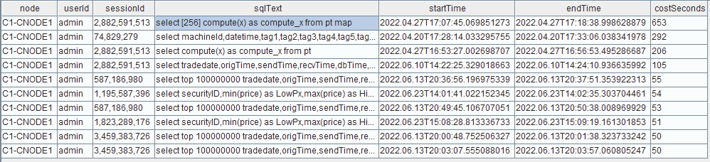 jobLogFile = getConfig(`jobLogFile) queryLog = loadText(jobLogFile) select node ,userId ,sessionId ,jobDesc as sqlText ,startTime ,endTime ,(endTime$DATETIME - startTime$DATETIME ) as costSeconds from queryLog order by (endTime$DATETIME - startTime$DATETIME ) desc limit 10