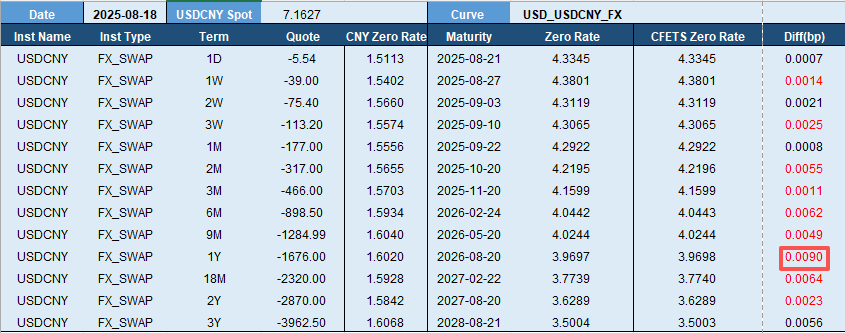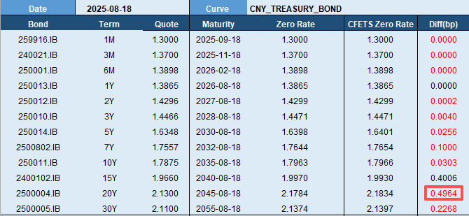 这里,我们根据外汇交易中心(CFETS)2025 年 8 月份国债收益率曲线构建基准债券列表,选取 2025 年 8 月 18 日收盘数据,通过 Bootstrap 方法得到即期曲线(“Zero Rate” 列),并与 CFETS 即期曲线(“CFETS Zero Rate” 列)进行对比,发现最大误差为期限 20Y 的 0.4964 个 bp,所有期限误差均小于 0.5 个 bp。