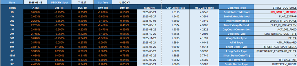 以外汇交易中心 2025 年 8 月 18 日数据为例,选取 USDCNY 外汇期权 delta 报价矩阵为参数,SVI 模型拟合波动率微笑,得到了外汇波动率曲面,该曲面可用作外汇期权的定价。