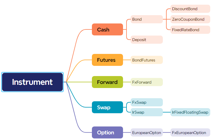 Instrument 类是对金融工具的抽象,用于建模各种资产和衍生品,所有金融工具都继承自 Instrument 基类。部分金融工具类名如下: