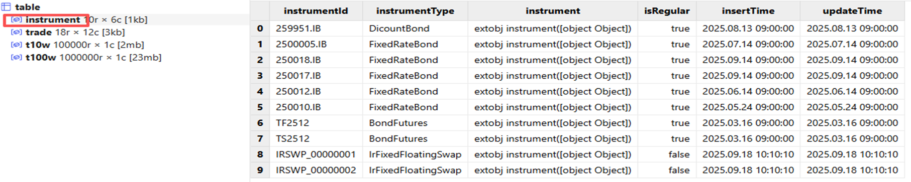 // 假设所有债券和利率互换基础信息存储在金融工具表(Instrument)的 instrument 字段中