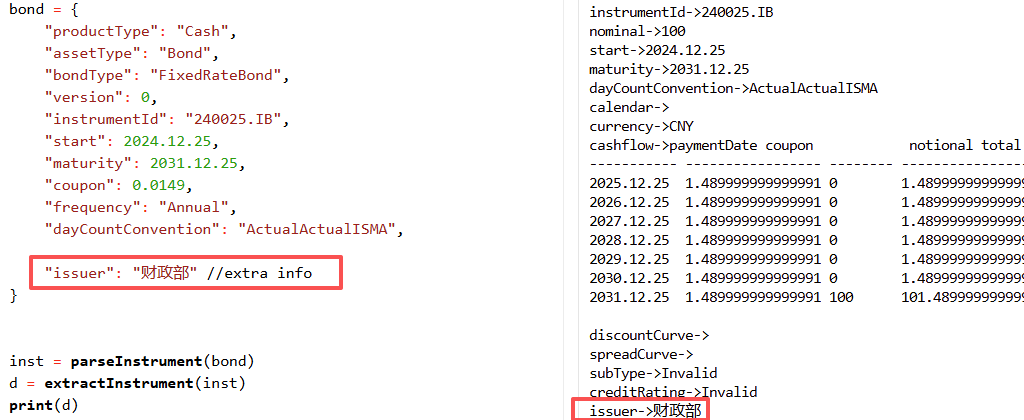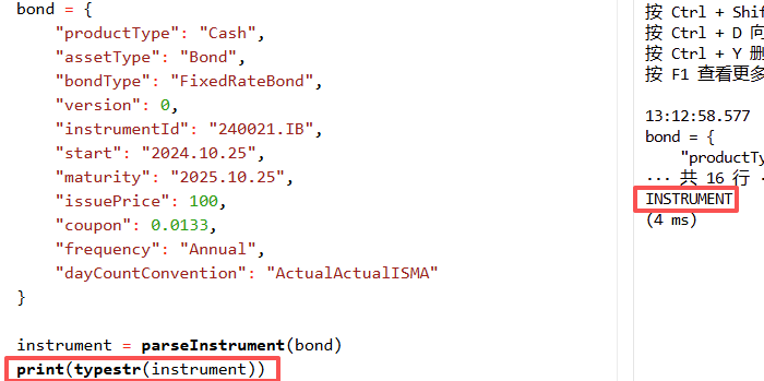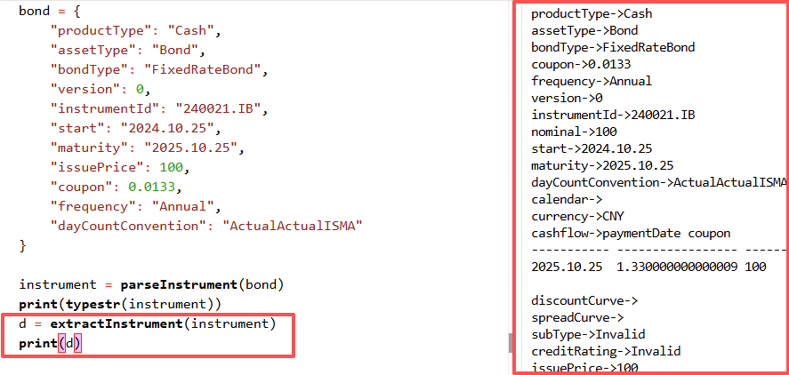 bondInstrumentCalculator 函数的第一个参数是 instrument,不同种类的债券都可以按照一定的结构封装到 instrument 中。