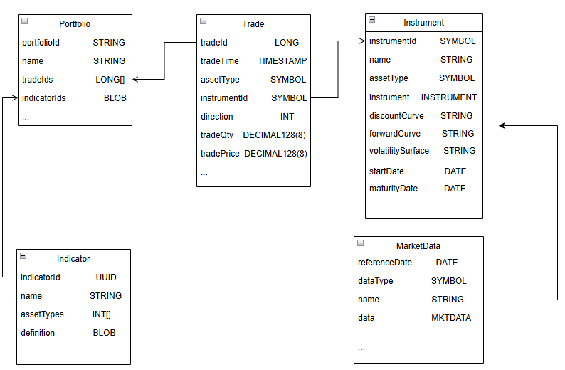 Instrument:金融工具表,用于存储金融工具的基本信息。其中 instrumentId 为 unique 的,对于标准型金融工具,一个 id 可以对应多笔交易;对于非标准型金融工具,一个 id 只能对应一笔交易。金融工具的基本信息,包括定价需要用到的市场数据(Curve/Surface)名称可以解析后放到 instrument 字段中,也可以放在外面, 方便定价时与 MarketData 表关联 。