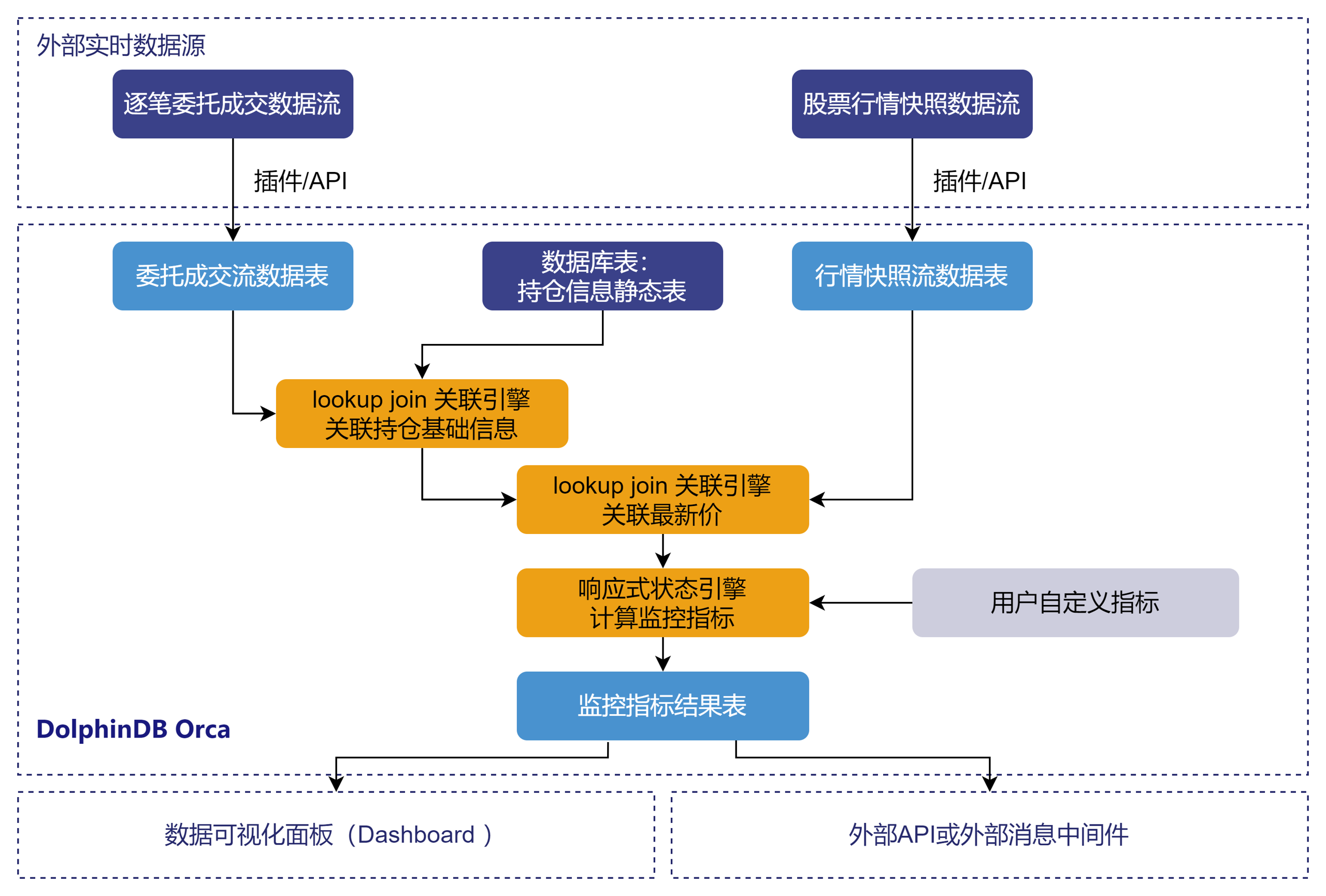 Orca 声明式 DStream API 通过简洁的编程风格实现了传统的流计算功能,降低了使用 DolphinDB 执行复杂流计算任务的开发难度。本文基于 Orca,提供了一种持仓监控指标实时计算的低延时解决方案,旨在为开发人员使用 DolphinDB 开发高性能流计算业务场景提供参考,从而提高开发效率。