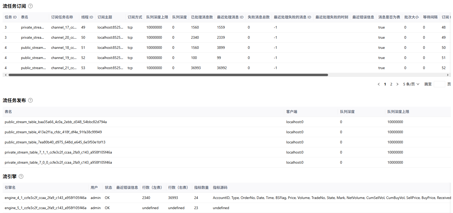 通过下方的流任务订阅、流任务发布和流引擎等表格,我们可以实时查看流图中订阅节点的工作线程状态、订阅表对应的发布端连接状态、以及引擎和流表的状态,如下图所示: