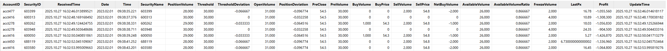 列名 类型 备注 AccountID SYMBOL 账户代码 SecurityID SYMBOL 证券代码 Date DATE 日期 SecurityName STRING 证券名称 Threshold INT 阈值数量 OpenVolume INT 期初数量 PreVolume INT 盘前持仓 PreClose DOUBLE 昨收价