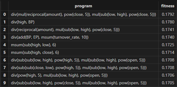 在自定义适应度函数方面,统一使用因子值与 ret20 的 Pearson 相关系数。在数据与算子层面上,统一使用 2020-08-12 至 2022-12-31 之间的全部交易日作为训练集,2023-01-01 至 2023-06-19 的全部交易日作为测试集。标的范围为3002只股票,训练集样本量为 1744162 条,测试集样本量为 333222 条。