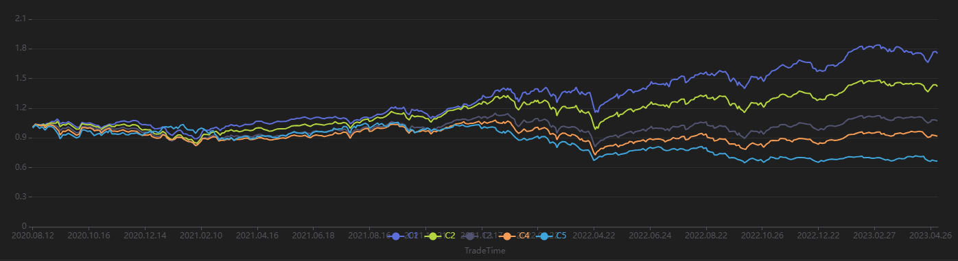 分层回测收益: Top 组 < Middle 组 < Bottom 组且 RankIC 稳定为负