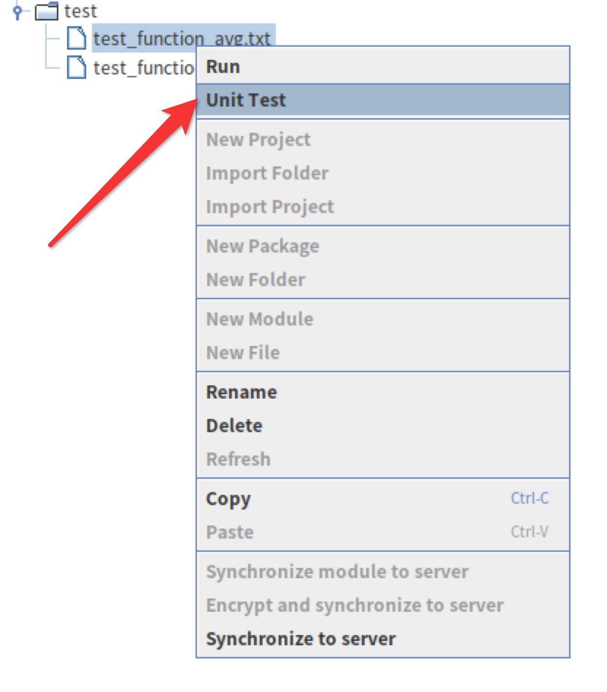 DolphinDB GUI 客户端安装及使用教程见:GUI 客户端,导入测试目录后,右键点击需要执行单元测试的文件名,然后点击 Unit Test 选项,即可对该测试文件执行单元测试,例如图 2-3 中对 test 目录下的 test_function_avg.txt 文件执行单元测试,也可以右键点击 test 目录名,此时会对 test 目录下的所有脚本文件(不包括子目录下的脚本文件)执行单元测试,并将结果打印在 Log 栏。